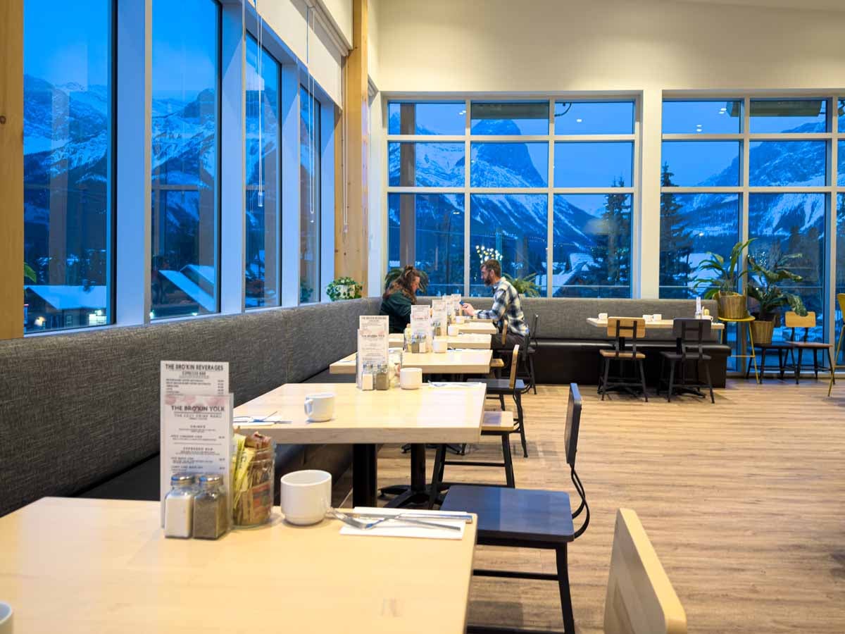 The Bro’Kin Yolk is one of the newer breakfast spots in Canmore. It’s part of a well-established Alberta breakfast-and-brunch chain They chose their Canmore location well, with an outstanding 2nd floor spot in the Shops of Canmore. Both locals and visitors alike will love the high windows offering a 270° view of the surrounding mountains, starting with Mount Lady MacDonald, wrapping around the Three Sisters and ending with Mt. Rundle.